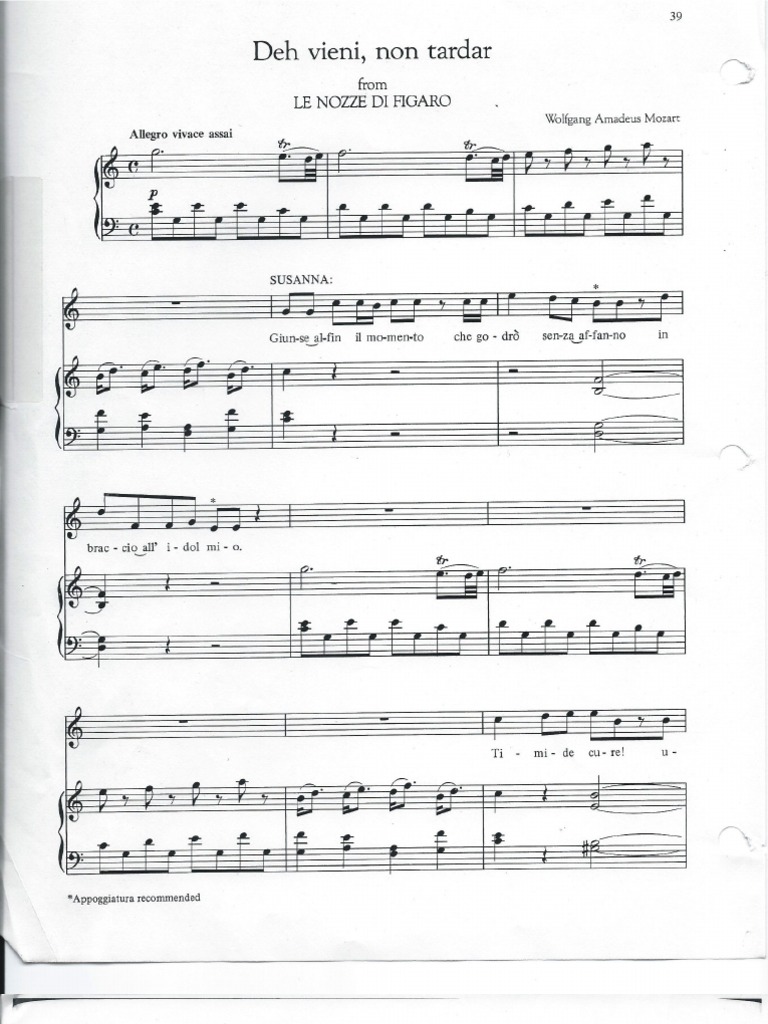 Download free for ipad today. Soprano aria from le nozze di figaro by wolfgang amadeus mozart, piano/vocal. Deh vieni, non tardar, o gioia bella, vieni ove amore per goder t'appella, finché non splende in ciel notturna face finché l'aria è ancor bruna e il mondo tace. Soprano voice, voice solo, piano accompaniment.